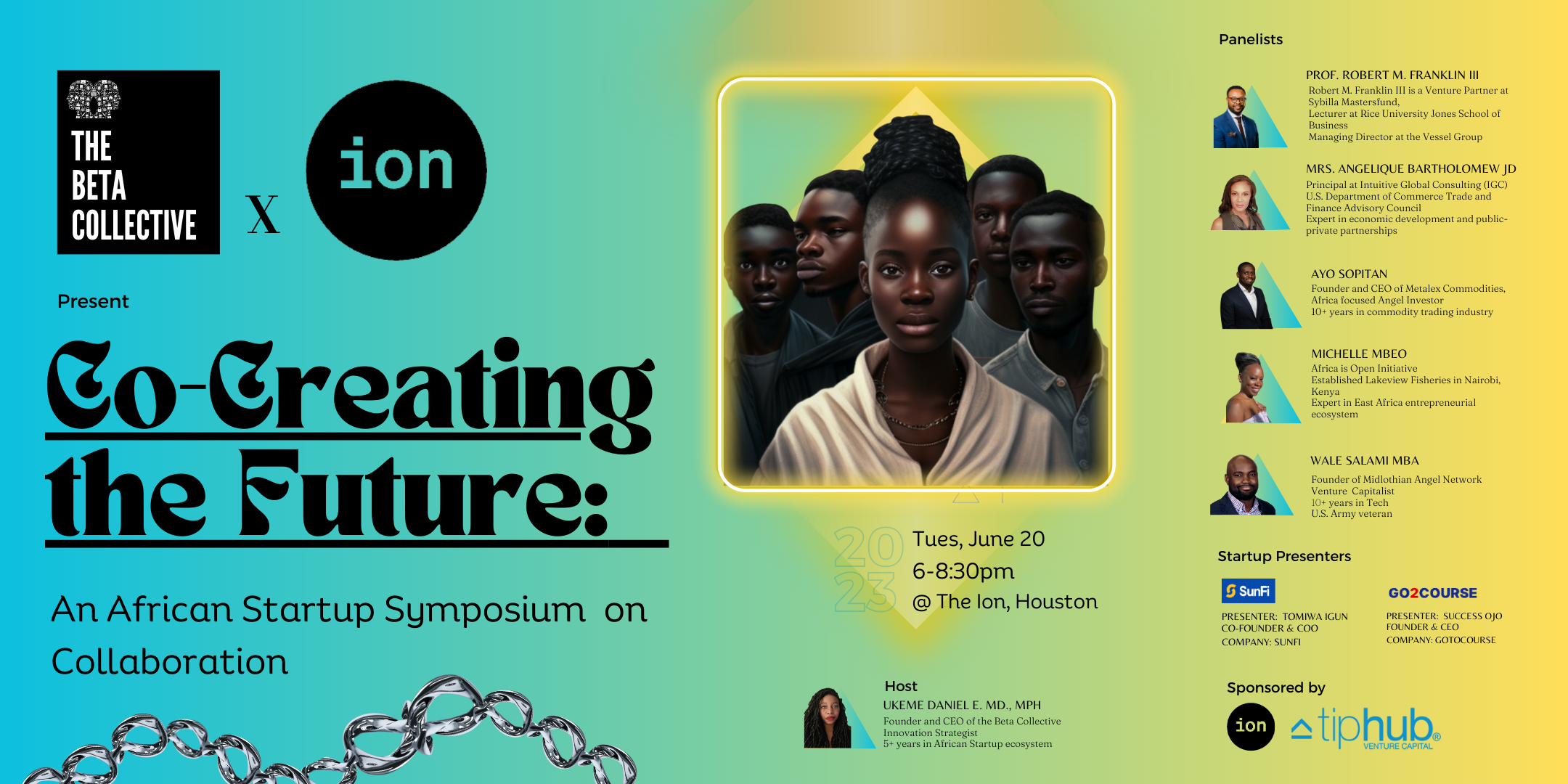 We are excited to invite you to an upcoming event that holds great significance for our local startup ecosystem. The Beta Collective, in collaboration with The Ion, is hosting the "Co-creating the Future" African Startup Symposium on Tuesday, June 20th, 2023.